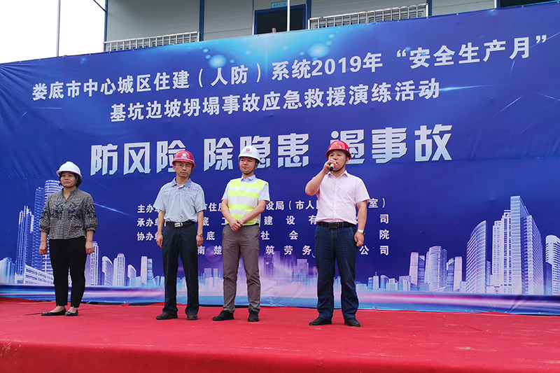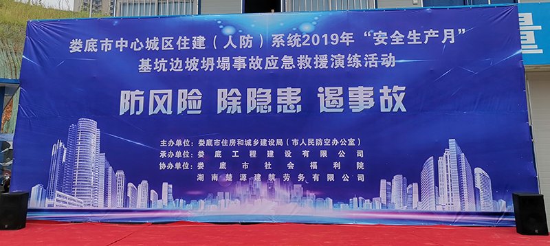 為深入貫徹黨的十九大和十九屆二中、三中全會精神,認真學習貫徹習近平總書記關于安全生產的重要論述,為新中國成立70周年營造良好的安全生產環境,積極響應省、市關于2019安全生產月活動的有關文件要求,加強建筑工地應對突發事件的處理能力,提高全員安全意識,切實掌握應急救援的技能、技巧,讓員工在事故發生時將傷害減少到最低。我司特承辦了由婁底市住房和城鄉建設局(人民防空辦公室)主辦的2019年“安全生產月”“防風險、除隱患、遏事故"建筑施工基坑坍塌事故應急救援演練活動。