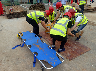 搶救組將傷員移至安全地帶,醫療救護組人員檢查傷員情況后,組織組對傷員進行了左小腿夾板和繃帶固定綁扎,并對傷員進行心肺復蘇和人工呼吸等急救救治